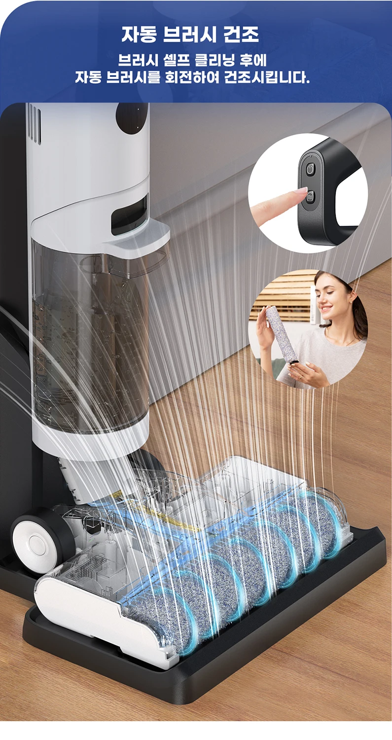 청소가 끝난 뒤 브러시를 자동으로 회전시켜 건조해 주기 때문에, 젖은 걸레에서 발생하기 쉬운 냄새·세균 문제를 줄이는 데 도움이 됩니다.